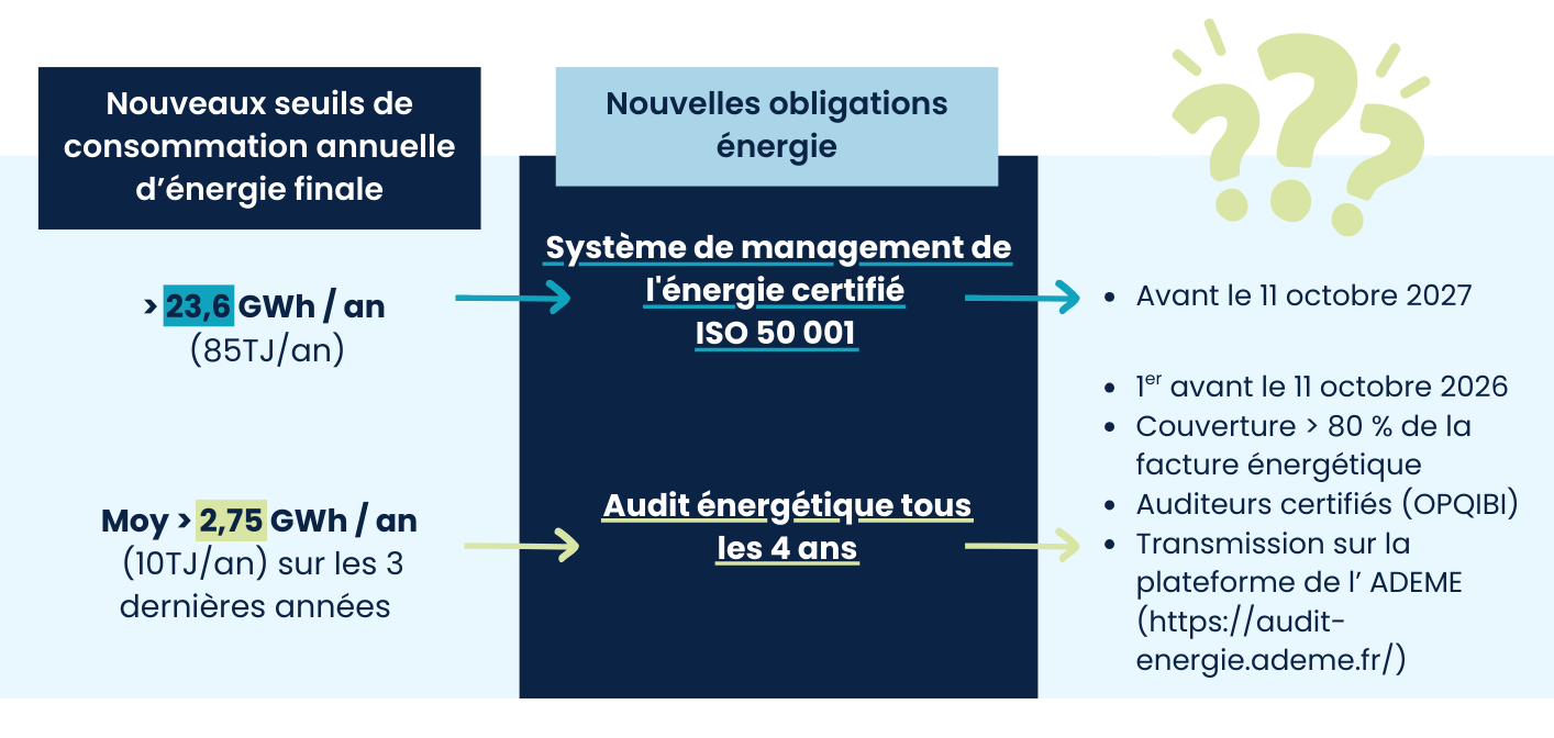 | > 23,6 GWh/an (85 TJ) | Mettre en place un Système de Management de l’Énergie (SME) certifié ISO 50001 | Avant le 11 octobre 2027 | Si l’entreprise dépasse ce seuil après cette date, elle doit se conformer dans l’année suivant les 3 dernières années civiles pendant lesquelles elle était au-dessous du seuil. |